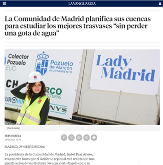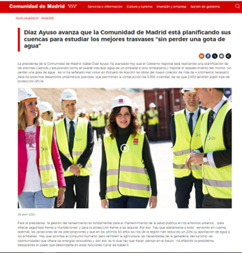 La Comunidad de Madrid planifica sus cuencas para estudiar los mejores trasvases “sin perder una gota de agua” Servimedia (29/04/2024) La Vanguardia, https://www.lavanguardia.com/sociedad/20240429/9605962/comunidad-madrid-planifica-cuencas-estudiar-mejores-trasvases-perder-gota-agua-agenciaslv20240429.html