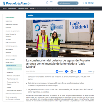 La construcción del colector de aguas de Pozuelo arranca con el montaje de la tuneladora “Lady Madrid” (29/04/2024) Pozuelo de Alarcón- Noticias. https://www.pozuelodealarcon.org/tu-ayuntamiento/gabinete-de-prensa/noticias/la-construccion-del-colector-de-aguas-de-pozuelo-arranca-con-el-montaje-de-la-tuneladora-lady-madrid