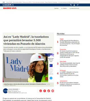 Fernández, F, (29/04/2024) Así es “Lady Madrid”, la tuneladora que permitirá levantar 5.500 viviendas en Pozuelo de Alarcón (29/04/2024) La razón.es. https://www.larazon.es/madrid/asi-lady-madrid-tuneladora-que-permitira-levantar-5500-viviendas-pozuelo-alarcon_20240429662f8b5b8e66020001bec484.html