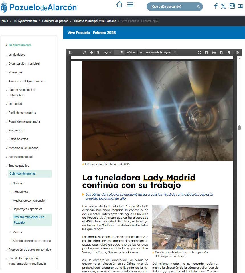 La tuneladora Lady Madrid continúa con su trabajo” (20/02/2025) Revista municipal Vive Pozuelo, febrero 2025. https://https://www.pozuelodealarcon.org/tu-ayuntamiento/gabinete-de-prensa/revista-municipal-vive-pozuelo/jueves-20/02/2025