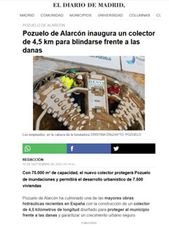 Pozuelo de Alarcón inaugura un colector de 4,5 km para blindarse frente a las danas” (10/09/2025) El diario de Madrid. https://www.eldiariodemadrid.es/articulo/municipios/pozuelo-alarcon-inaugura-colector-45-km-blindarse-frente-danas/20250910151459109186.amp.html